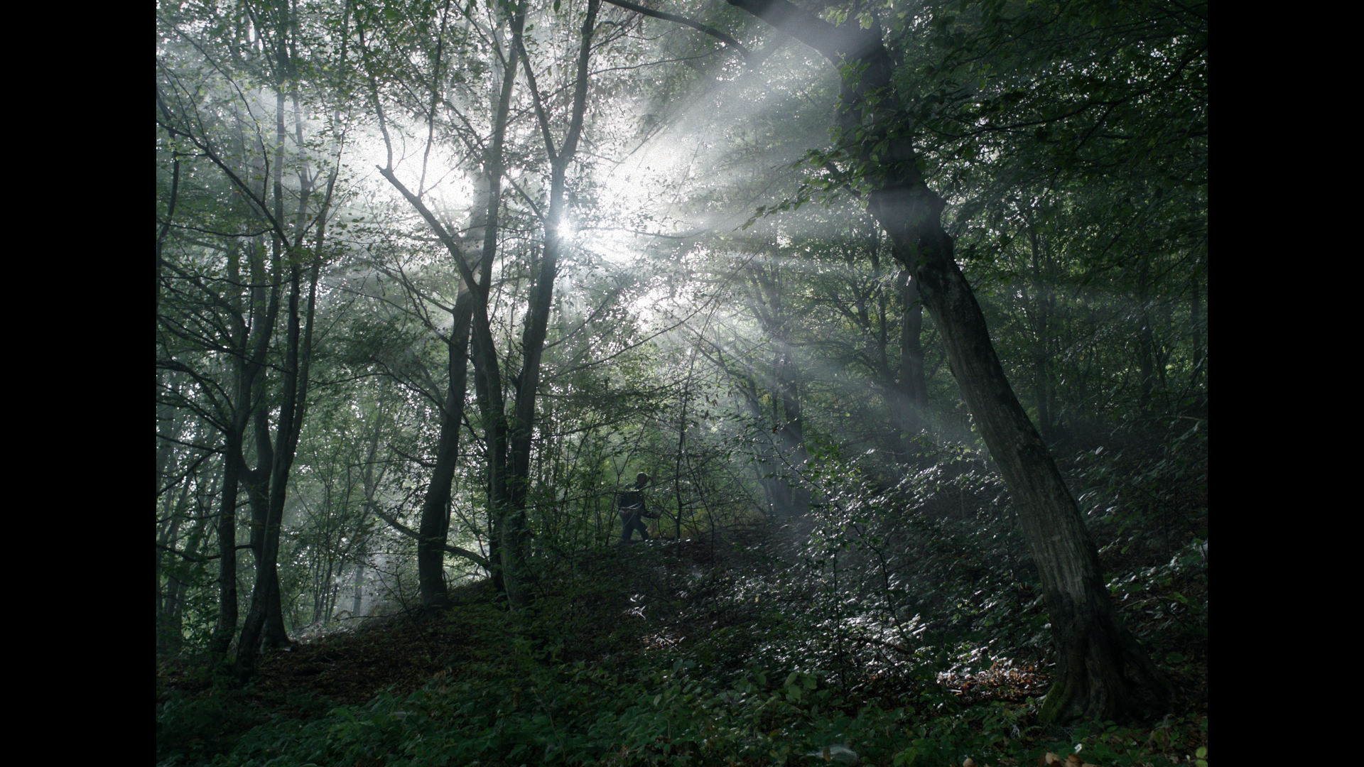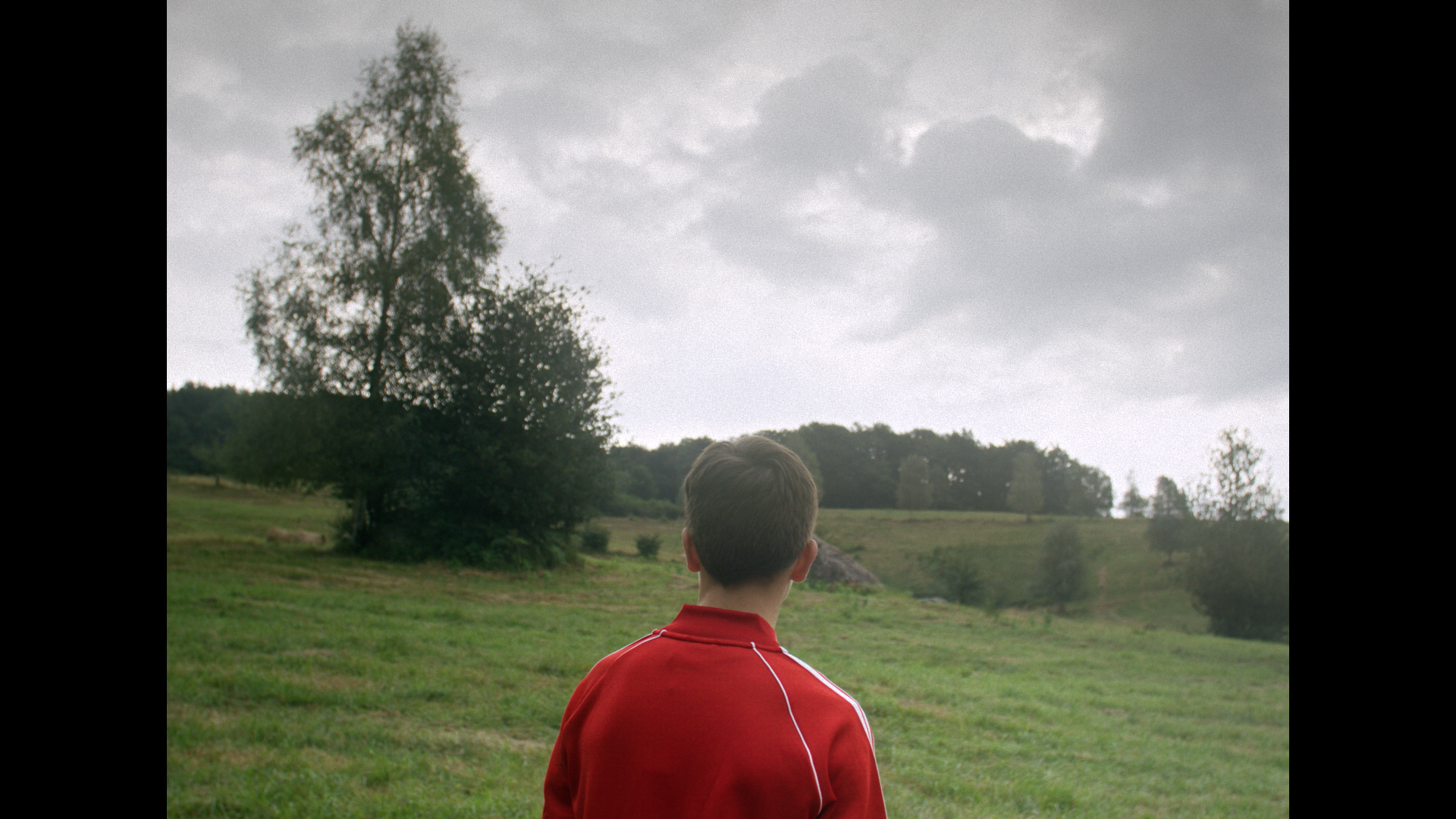 In questo contesto entra in scena il “bambino con la tuta rossa”. Il colore dei suoi abiti interrompe l’uniformità del paesaggio e segna la presenza di una figura all’apparenza fragile. In mezzo al verde e all’ombra, il rosso resiste. Non si lascia inghiottire dal bosco, non scompare nel silenzio. Resta visibile, come memoria che non vuole spegnersi, come vita che continua a imporsi anche quando resta solo una fragile speranza.